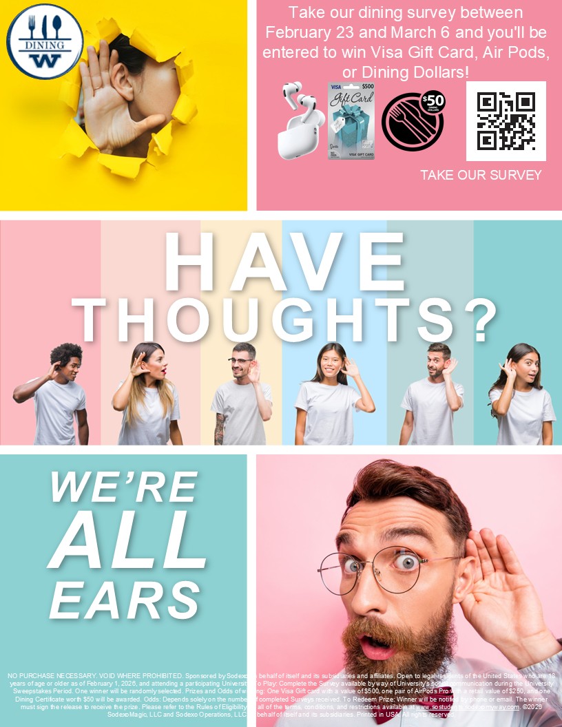 NO PURCHASE NECESSARY. VOID WHERE PROHIBITED. Sponsored by Sodexo on behalf of itself and its subsidiaries and affiliates. Open to legal residents of the United States who are 18 years of age or older as of February 1, 2026, and attending a participating University. To Play: Complete the Survey available by way of University’s social communication during the University Sweepstakes Period. One winner will be randomly selected. Prizes and Odds of winning: One Visa Gift card with a value of $500, one pair of AirPods Pro with a retail value of $250, and one Dining Certificate worth $50 will be awarded. Odds: Depends solely on the number of completed Surveys received. To Redeem Prize: Winner will be notified by phone or email. The winner must sign the release to receive the prize. Please refer to the Rules of Eligibility for all of the terms, conditions, and restrictions available at www.sostudents.sodexomyway.com. ©2026 SodexoMagic, LLC and Sodexo Operations, LLC on behalf of itself and its subsidiaries. Printed in USA. All rights reserved.